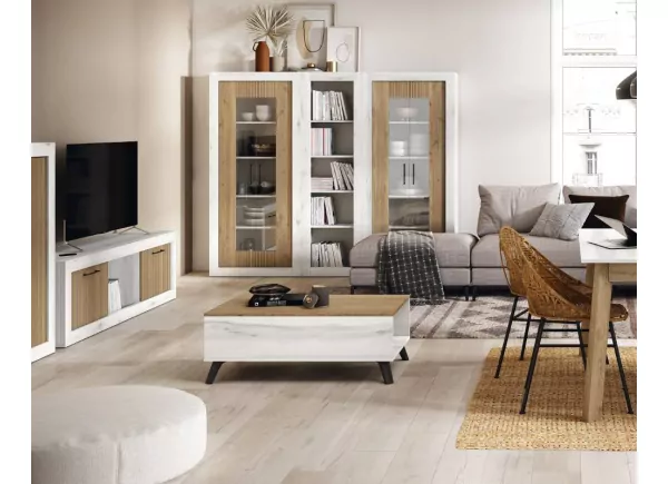 Aparador de salón en color blanco albo combinado con color naturale y rayado.