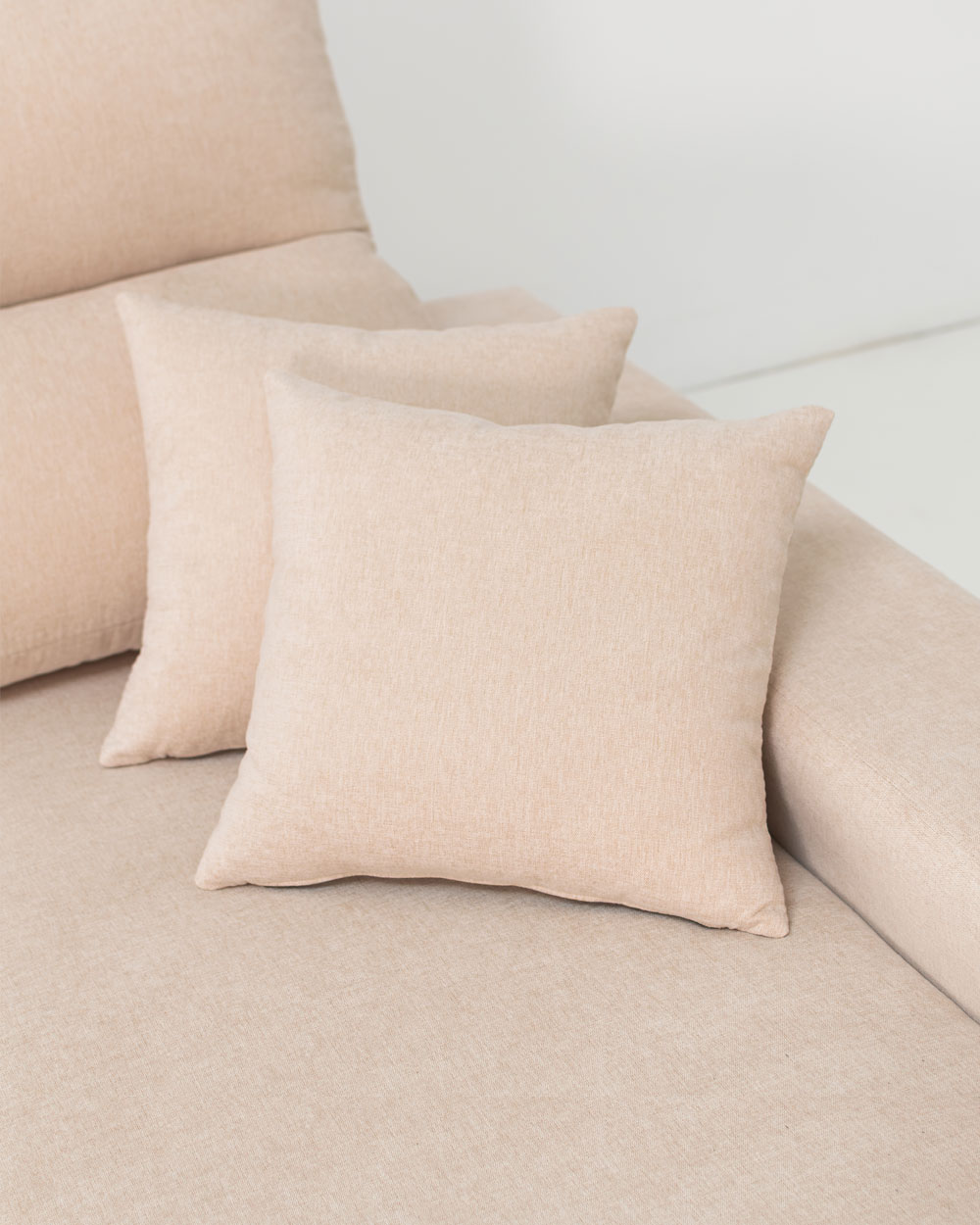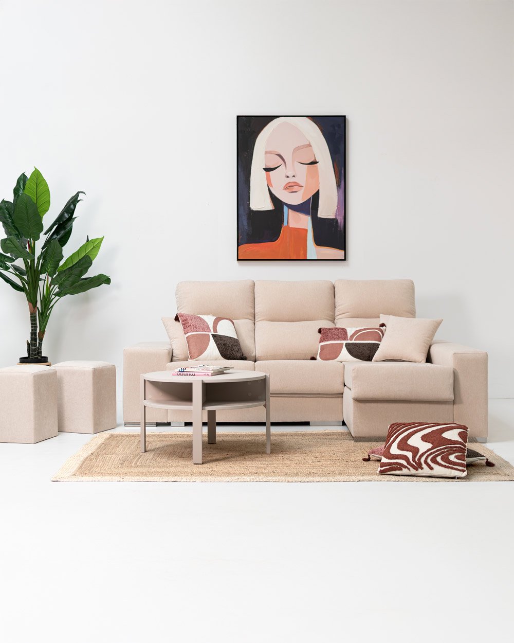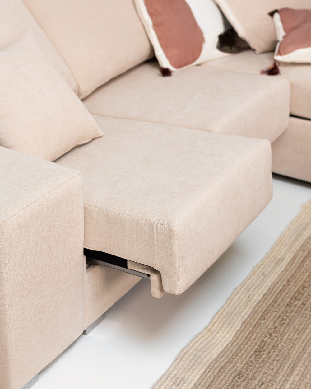 Chaise longue con arcón abatible, cabezales reclinables y dos pufs integrados en el brazo.