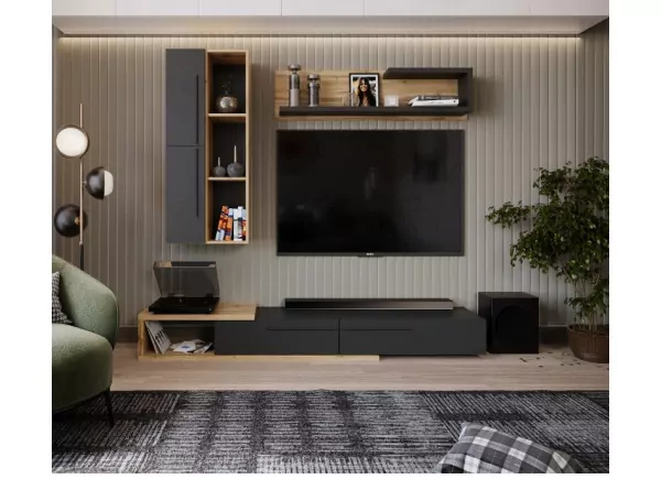 Mueble de Salón. Nuestro mueble de salón combina funcionalidad y estética. Con compartimentos abiertos y cerrados, es ideal para exhibir tus libros, adornos y dispositivos electrónicos. La calidad y los detalles cuidadosamente diseñados hacen que este mueble sea una joya en tu sala de estar.