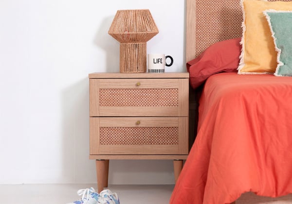 Cómoda de 3 cajones y 1 contenedor acabado en color haya natural y frentes en ratán.