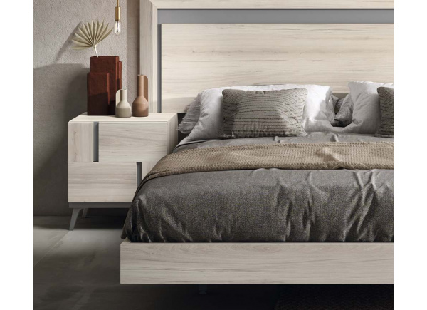 Formado por un cabecero con luz led opcional y 2 mesitas con patas y guías en los cajones.