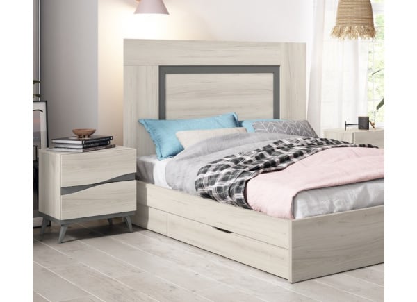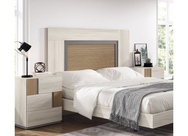 Dormitorio de matrimonio para somier y colchón de 135 ó 150 cm no incluidos. Formado por un cabecero y 2 mesitas con patas.