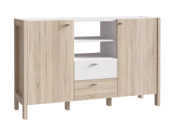 El aparador tiene un espacio de almacenamiento con dos puertas batientes y dos cajones. Es perfecto si quieres ahorrar espacio. Además es moderno y original, con un estilo muy nórdico.