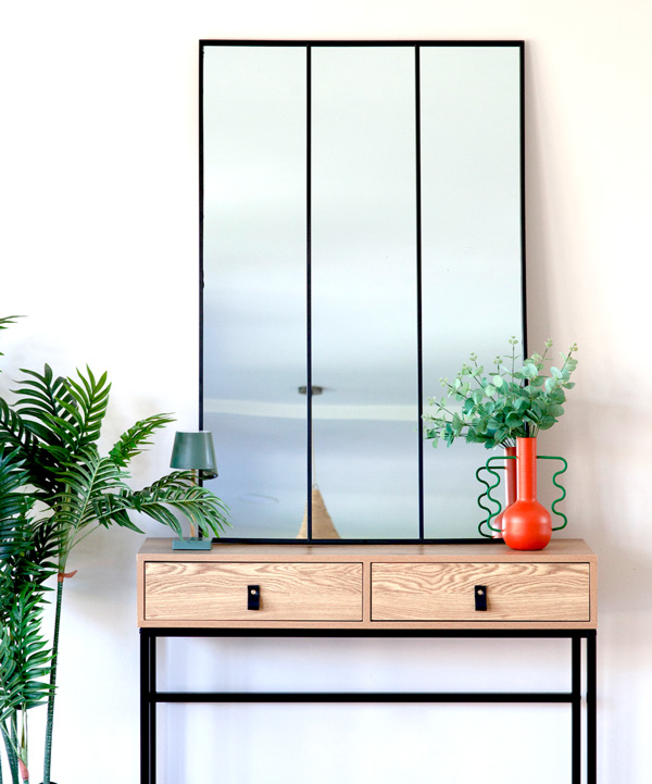 La consola con acabado en roble y patas en metal negro le queda de diez. La buscó con dos cajoncitos para guardar el maquillaje y otros básicos para el último retoque porque Aitana tiene un flow coqueto next level. Lo mismo que el espejo Gelio, con un diseño muy top dividido en tres ventanas y con un marco negro que es una oda a la elegancia.
