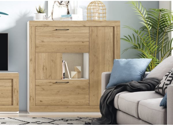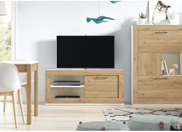 Mesa televisión con almacenaje, en color blanco mate combinado con naturale. Medidas: 126 x 41 x 53 cm alto.