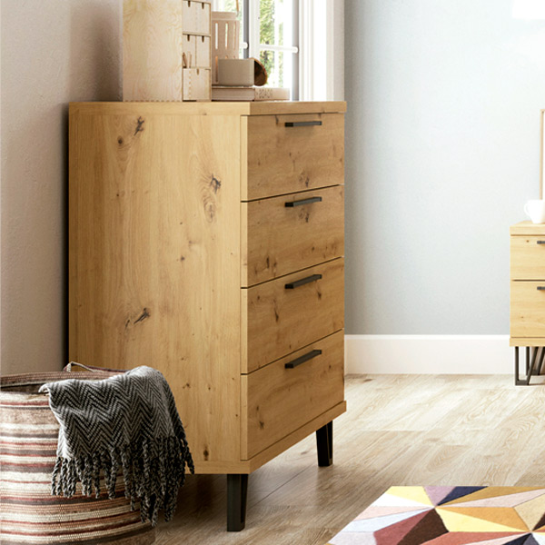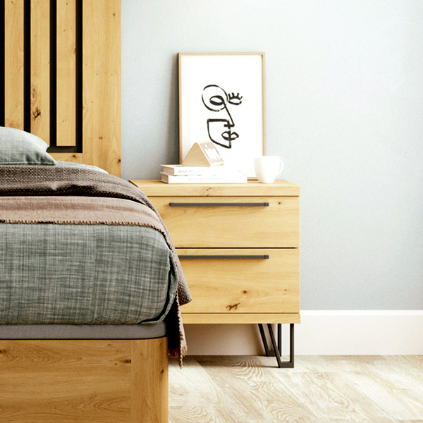 El acabado artisan con detalles en color grafito en tiradores y patas se combina perfectamente con el toque de madera y las patas metálicas, creando una estética que es a la vez natural e industrial. Este contraste agrega un toque contemporáneo y chic a tu dormitorio, infundiendo un aire de modernidad sin sacrificar la calidez y la comodidad.