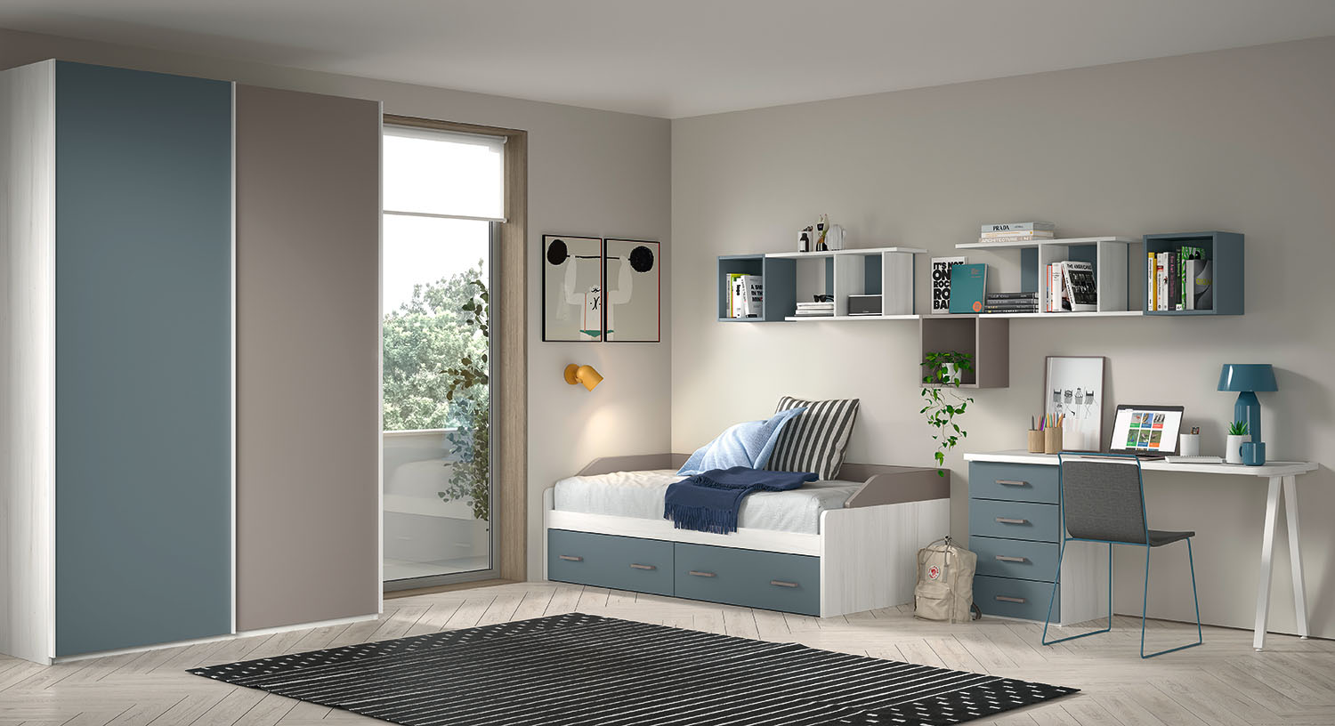 - Compacto com duas camas e gavetas ou uma terceira cama auxiliar.