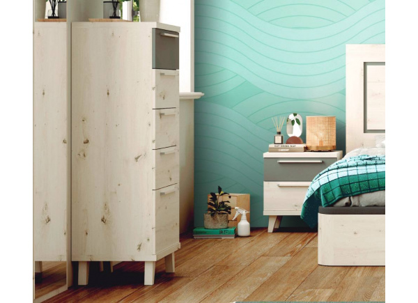Cómoda alta com 5 gavetas e pés. Acabamento em cor Albian com detalhes em Chumbo.