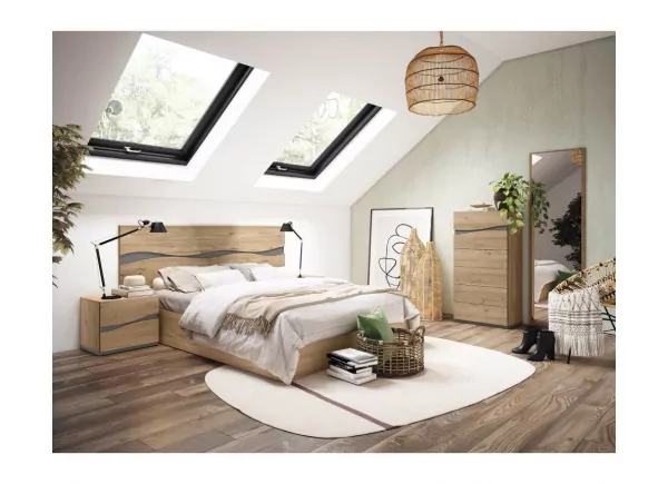 Dormitorio de matrimonio para somier y colchón de 135 ó 150 cm no incluidos. Formado por un cabecero y 2 mesitas con guías en los cajones.
